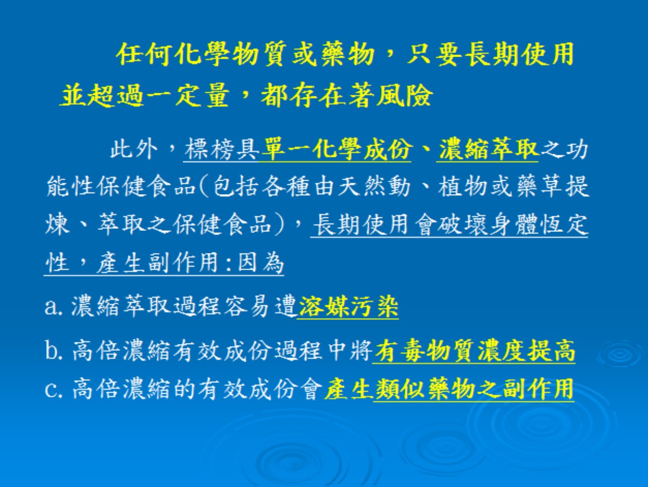 4. 健康食品不得干擾人體正常功能,否則只是針對特殊病人的藥品。草本植物高倍濃縮較易產生類似藥物毒性。